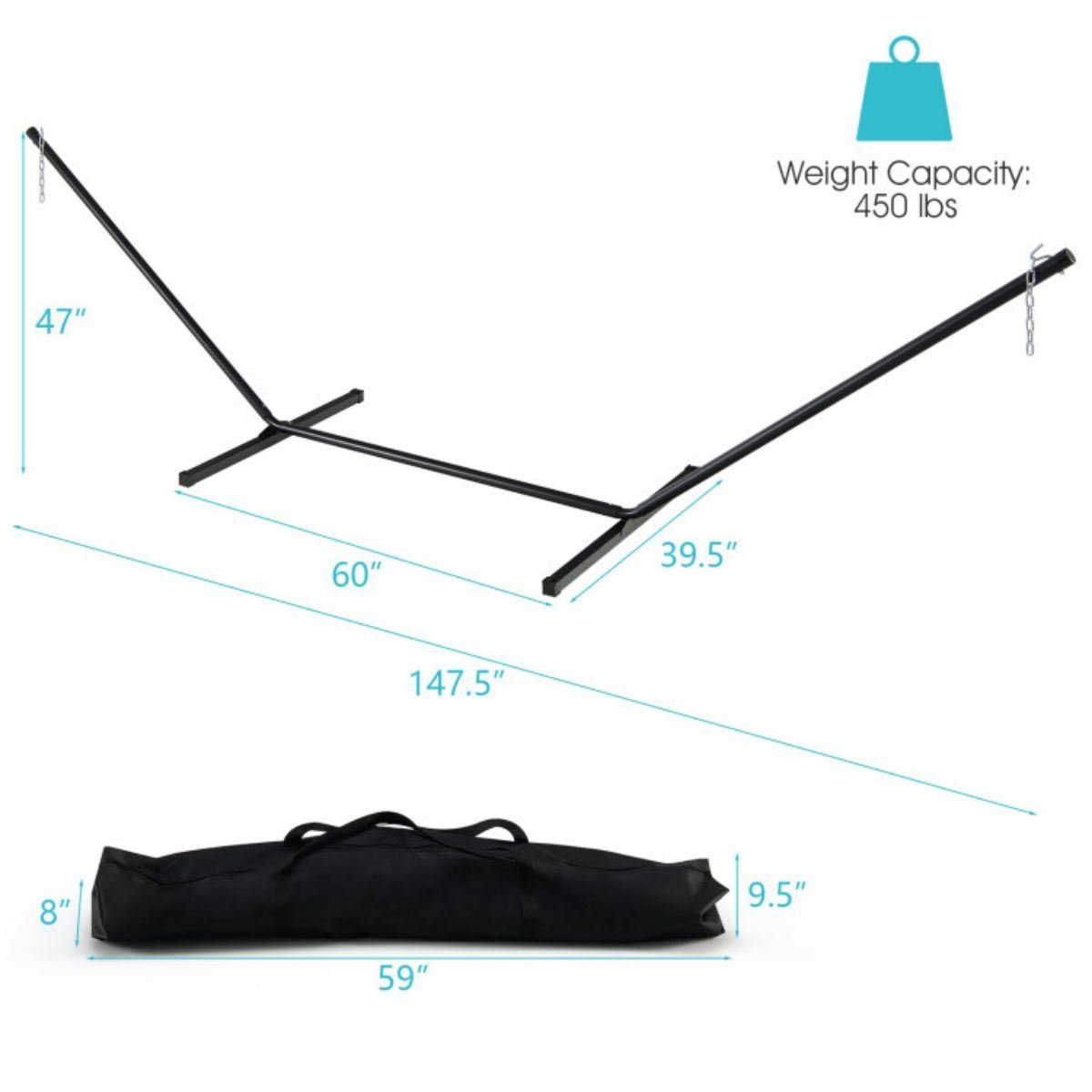 The whole frame of this hammock stand is made of sprayed steel tubes which ensure excellent load capacity of 450 lbs and rustproof performance.