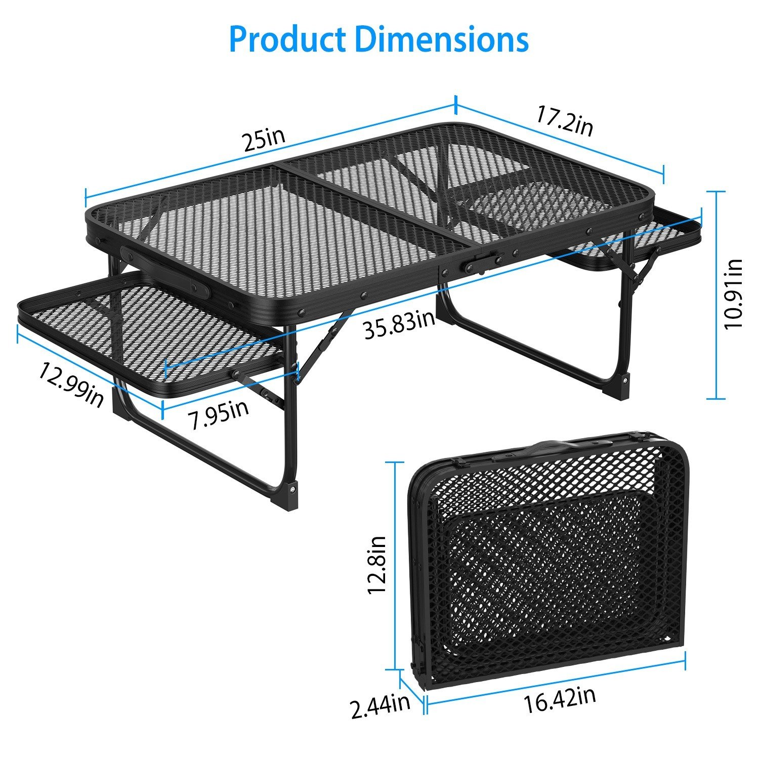 *Premium Materials*:This outdoor folding table is made of spray layer iron mesh(desktop) and aluminum alloy frame. Load capacity reaches up to 88lbs and scalding resistant is up to 158℉. Safety latch and locks ensure stable expansion. Come with 4Pcs anti-slip feet,ensure you better support in outdoor activities.