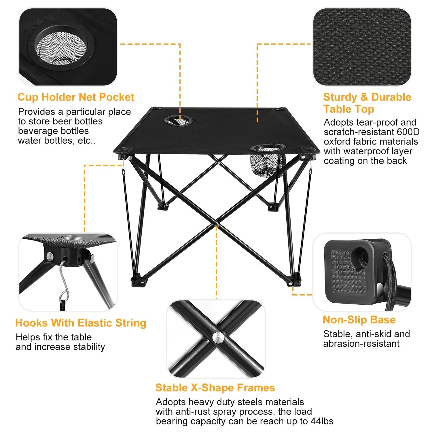 **STURDY & DURABLE TABLE TOP*:Made from thickened 600D oxford fabric materials,the table top of our table is tear-proof,scratch-resistant,abrasion-resistant and stain-resistant. And its back side is coated with waterproof layer to protect against water permeation.