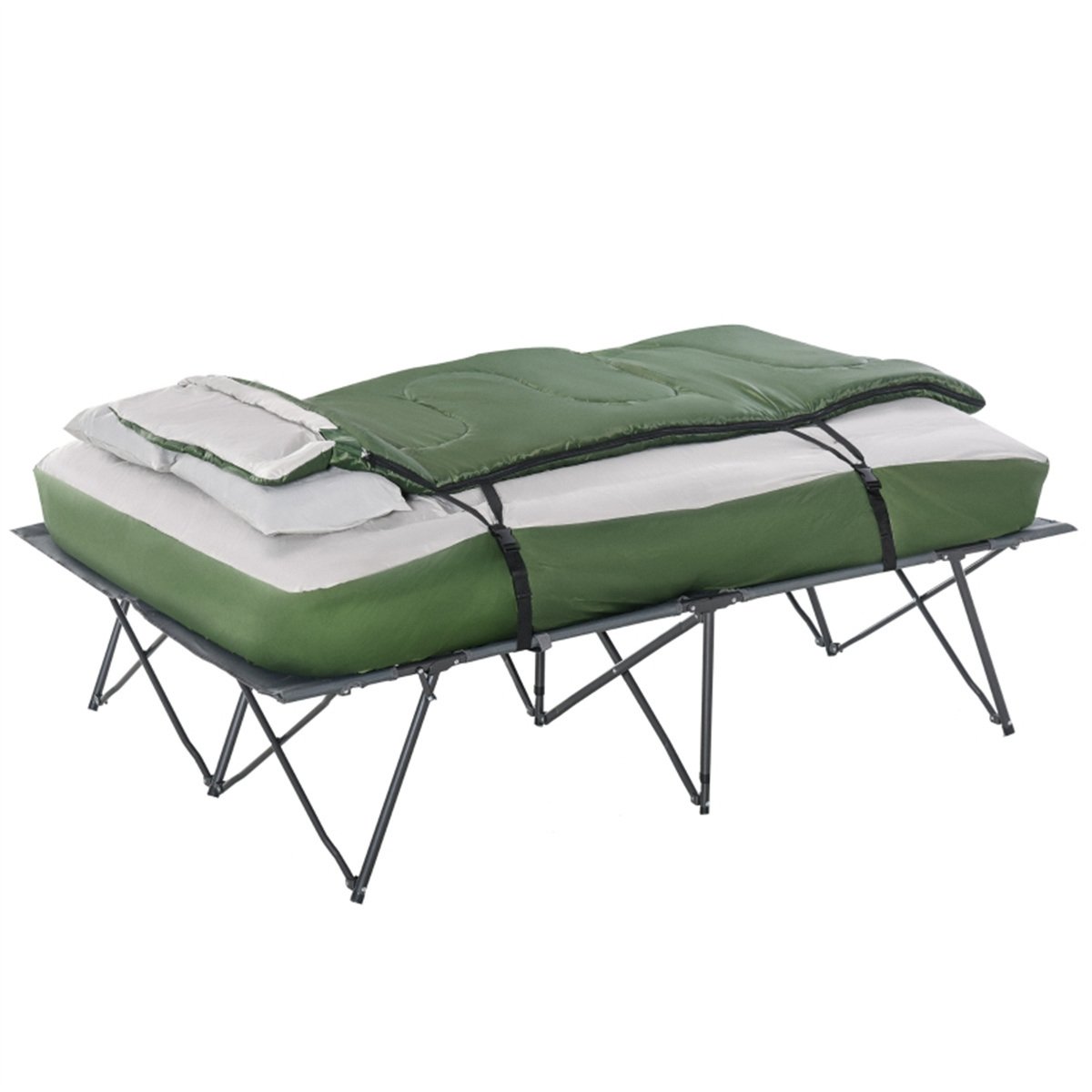 Features:- 2-person cot for camping: a cot, inflatable sleeping air mattress, a sleeping pad, 2 pillows, 2 pillowcases, a foot pump, a textile cover, a sleeping bag and a carrying bag- The portable tent beds for camping's air mattress inflates quickly with the included foot pump- Portable and collapsible set, all fits in a carry bag- The sleeping cot for adults and the air mattress can be used separately or together- Zippered single sleeping bag can also be unfolded as a large size blanket for two people- Assembly requiredSpecification:- Color: Gray, Green- Material: Polyester, PVC Coated Oxford Fabric, Metal- Bed Dimension: 75.5" W x 50" D x 25.25" H (Extended), 39.25" W x 8.75" D x 4.25" H (Folded)- Mattress Dimension: 74.75" W x 50" D x 7.75" H- Sleeping Bag Dimension: 77.5" L x 28.25" W- Weight Capacity: 352 lbsPackage Includes:- 1 x Camping Cot- 1 x Inflatable Sleeping Air Mattress- 2 x Pillows- 2 x Pillowcases- 1 x Foot Pump- 1 x Textile Cover- 1 x Sleeping Bag- 1 x Carrying Bag- 1 x Manual