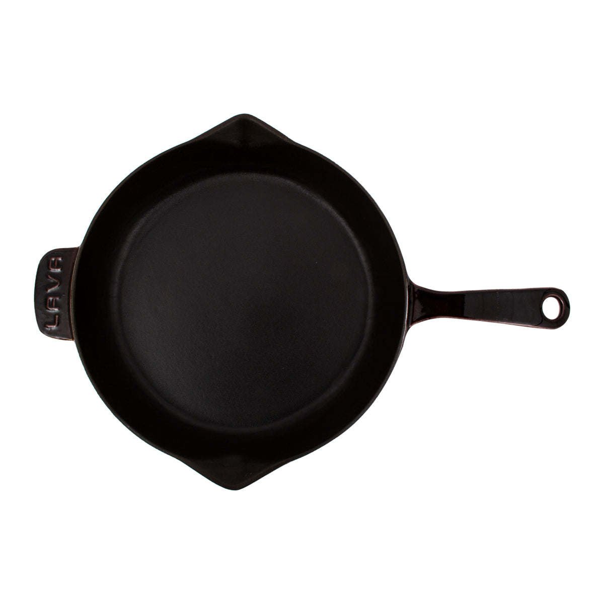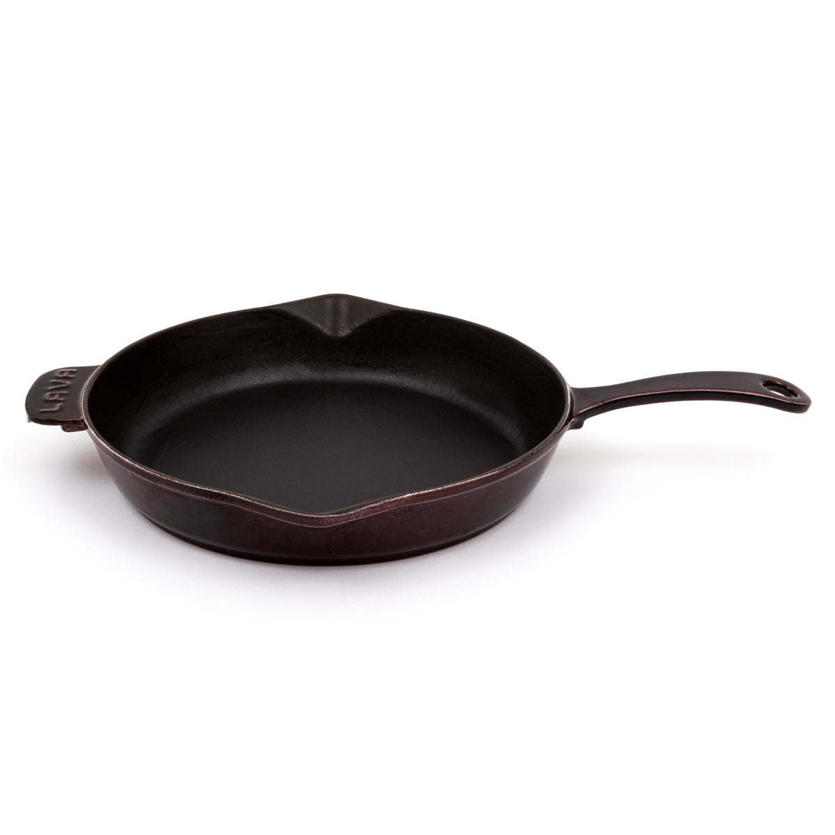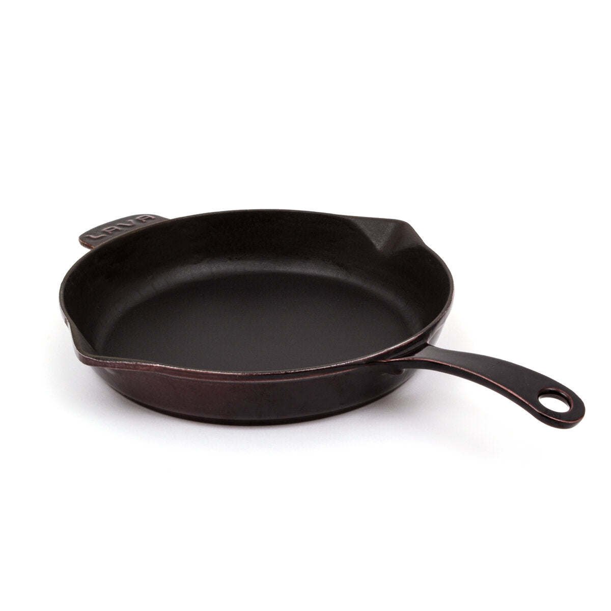 LAVA CAST IRON SKILLET: Lava is specialized for heating and appliance industry. With 40 years of experience in casting molding, sand preparation, melting, sandblasting/grinding and enamel coating plant as the leading company in the world, Lava's main production issue; cast iron cookware, pans, grills and stove top casting grills. The world's highest quality cast iron is processed together with electrophoresis enamel coating technology in the production facilities of the ISO9001 standard. 3-LAYER ENAMEL COATING: Lava cast iron skilllet has been coated with 3 layers of enamel with 3 stages of firing technique. Primer layer protects the product against corrosion, gives resistance to high temperatures and thermal shock, the 2nd layer enamel gives high scratch and wear resistance and creates a flavor layer, 3rd layer enamel makes a smooth, attractive surface that is easily cleaned and adds a perfect elegance in presentation. PROTECTIVE GLASS ENAMEL: The cooking surface of this frying pan is glass enamel. Since this enamel shows the properties of glass, it has a transparent color, so the inner surface preserves its original casting color. Glass is a natural and a non-toxic coating that will protect the surface and maintain it for longer periods of time. Not only it makes this pan versatile and easy to use but also gives a smooth and shiny surface that is both easy to clean and requires no seasoning before use. HEAT RETENTION: This fry pan has 2.4-qt. capacity and it weighs 5 pounds. Its strong heat distrubition and retention make it great for searing steaks and frying potatoes, vegetables and eggs. The smooth interior makes sure that everything inside is cooked evenly, and it releases food easily. It can be used on all kitchen stovetops (except the microwave), and it's oven safe to 500 degrees F. HOW TO CLEAN LAVA ENAMELED CAST IRON: Although Lava enameled cast iron is dishwasher safe, hand washing with warm soapy water and a nylon scrub brush is recommended to preserve the cookware's original appearance. Always dry cookware thoroughly and store in a cool, dry place. To remove stubborn baked-on food, boil 2 cups of water and 4 tablespoons of baking soda. Boil for a few minutes, then use a pan scraper to loosen the food