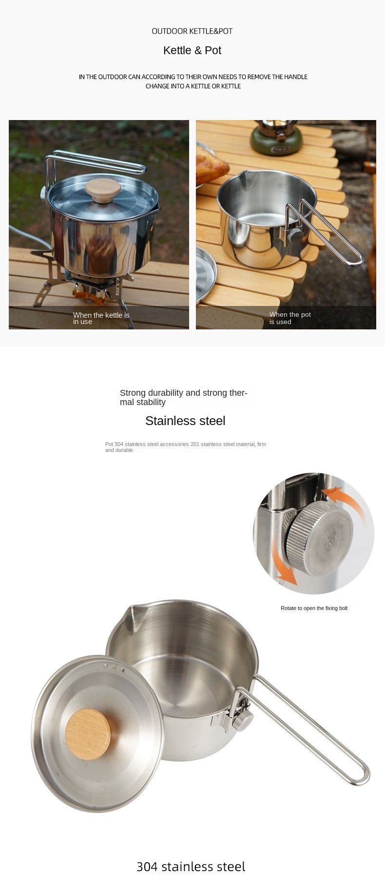 Material: pot body - 304 stainless steel / accessories - 201 stainless steel / pot lid handle - beech wood