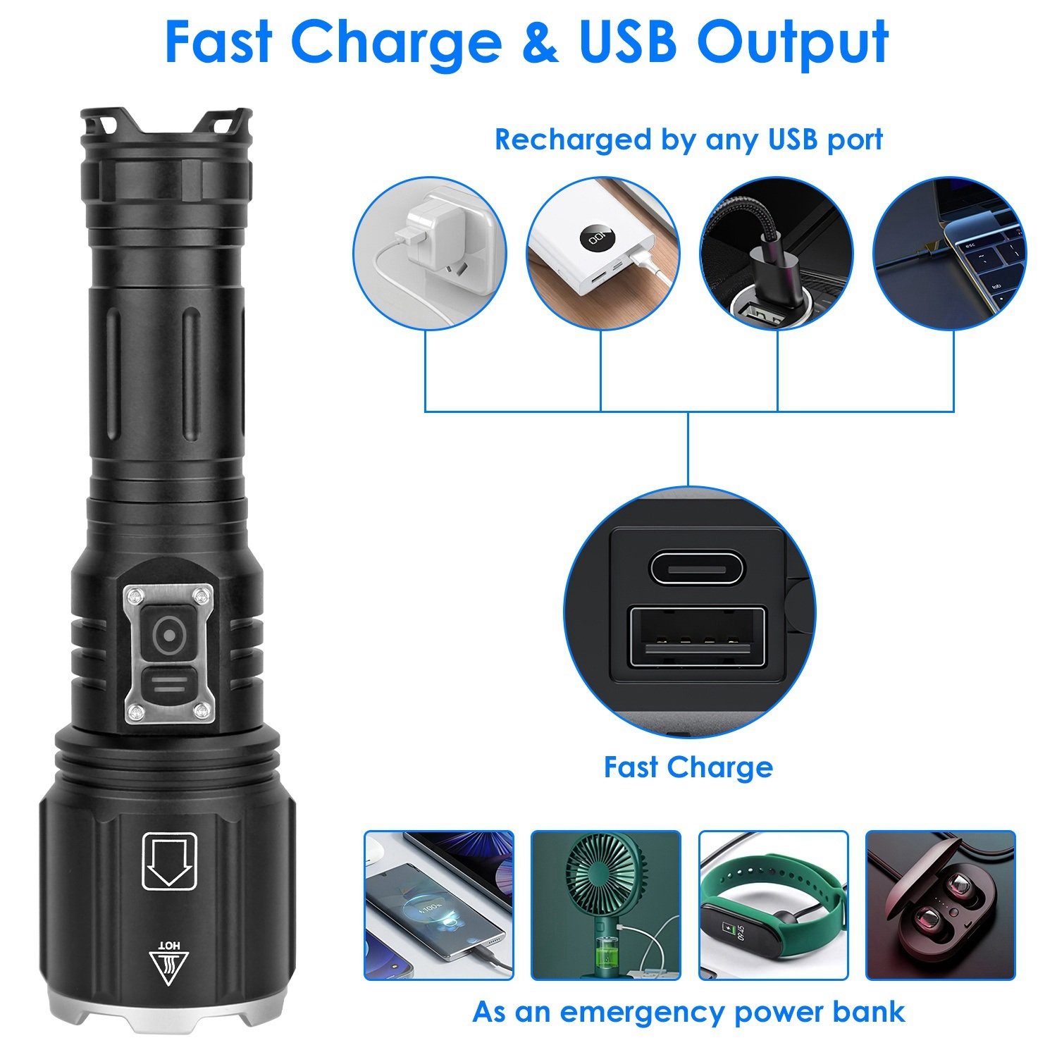 *Multifunctional Flashlight*:When our phone is dead or in low battery; we can use this multifunctional flashlight as an emergency power bank. When we are stalked; we can use it as a self-defense weapon because the ultra-strong or strobe white light can defend ourselves and SOS white light can use for seeking help. When we get stuck; we can utilize its diamond-shaped head structure as a window-breaking hammer to escape.